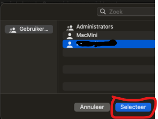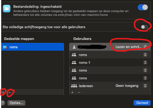 We zien het scherm met alle gebruikers die rechten hebben, deze kun je verwijderen met de minus knop, toevoegen met de plus knop.
