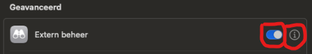 Activeer extern beheer in via de toggle knop. Via de info knop kunnen we verder instellen.